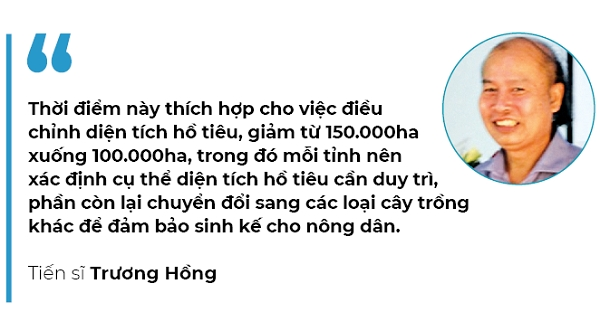 Theo Tiến sĩ Trương Hồng, quyền Viện trưởng Viện Khoa học kỹ thuật Nông lâm nghiệp Tây Nguyên (WASI), thời điểm này thích hợp cho việc điều chỉnh diện tích hồ tiêu, giảm từ 150.000ha xuống 100.000ha, trong đó mỗi tỉnh nên xác định cụ thể diện tích hồ tiêu cần duy trì, phần còn lại chuyển đổi sang các loại cây trồng khác để đảm bảo sinh kế cho người nông dân. Tất nhiên, ngành tiêu cũng cần Nhà nước đầu tư các cơ chế, chính sách phù hợp với thực tế thị trường.