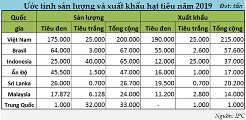 IPC ước tính Việt Nam sản xuất 175.000 tấn hạt tiêu đen và 25.000 tấn tiêu trắng trong năm 2019, tức là tổng cộng 200.000 tấn, tiếp tục giữ vị trí nước sản xuất lớn nhất thế giới. Nếu so với năm 2018, sản lượng của Việt Nam đã giảm nhẹ do diện tích trồng tiêu ít đi. Việt Nam bắt đầu tập trung vào cải thiện chất lượng hạt tiêu hơn là tăng sản lượng. Cụ thể là giảm sử dụng hóa chất và nỗ lực phát triển sản xuất hạt tiêu hữu cơ.