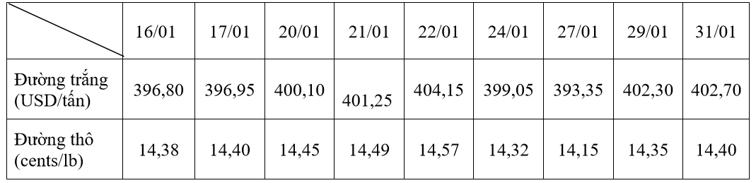 Giá đường thô (được đo bằng giá hàng ngày của ISA) được cải thiện từ 13,24 US cent/pound, được niêm yết vào đầu tháng, lên 14,57 US cent/pound vào ngày 23/1, mức giá kỉ lục cao nhất trong 24 tháng.
