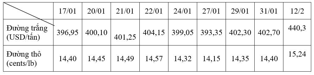 Giá đường thô (được đo bằng giá hàng ngày của ISA) được cải thiện từ 13,24 US cent/pound, được niêm yết vào đầu tháng 1, lên 14,57 US cent/pound vào ngày 23/1, đến ngày 12/2 đã lên đến 15,24 US cent/pound mức giá kì lục cao nhất trong 24 tháng, tuy nhiên phiên giao dịch 13/2 đã xuất hiện dấu hiệu điều chỉnh giảm của thị trường..