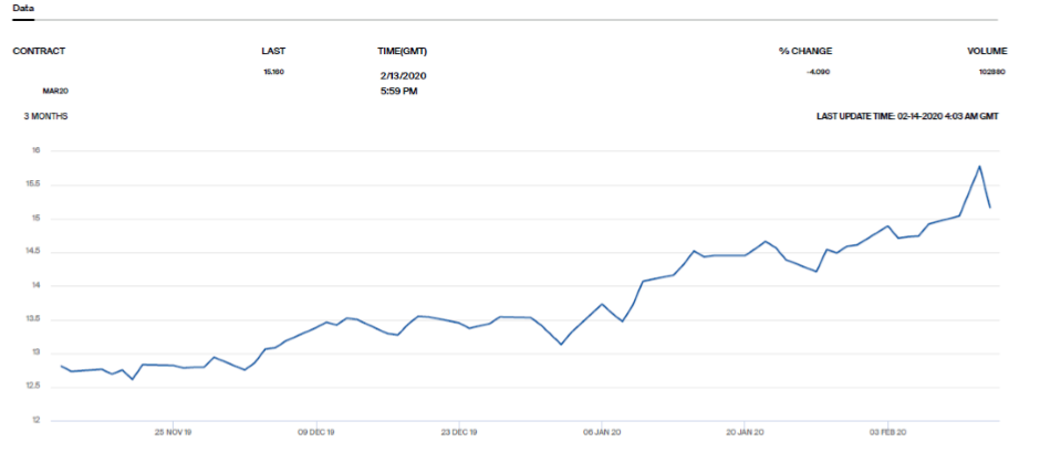 Đường trắng trên sàn London đến 20/1/2020 vượt ngưỡng 400 USD/tấn, đến 31/1/2020 đạt 402,70 USD/tấn, đến 12/02 đã lên đến mức 440,3 USD/tấn và cũng phiên giao dịch 13/2 đã xuất hiện dấu hiệu điều chỉnh.