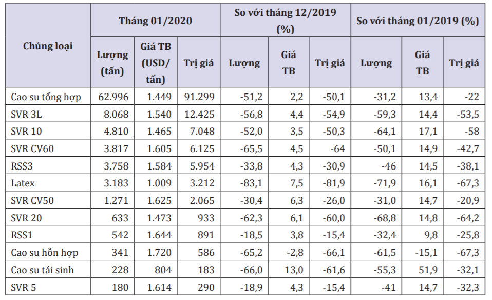 Lũy kế 2 tháng đầu năm 2020, xuất khẩu cao su ước đạt 160.000 tấn, trị giá 231 triệu USD, giảm 32,4% về lượng và giảm 24,2% về trị giá so với cùng kì năm 2019; giá xuất khẩu bình quân tăng 12,2% so với cùng kì năm 2019, lên mức 1.445 USD/tấn.