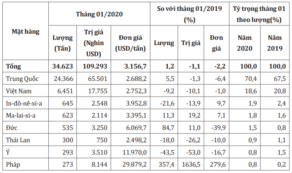 Mặt hàng này nhập khẩu chủ yếu từ một số thị trường chính như: Trung Quốc, Việt Nam, Malaysia, Pháp…