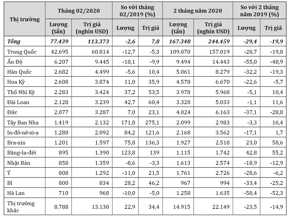 Trong tháng 2/2020, Trung Quốc vẫn là thị trường xuất khẩu cao su lớn nhất của Việt Nam, đạt gần 42.700 nghìn tấn, trị giá 60,81 triệu USD, giảm gần 36% về lượng và giảm 37% về trị giá so với tháng 1/2020; đồng thời giảm 12,7% về lượng và giảm 5,3% về trị giá so với tháng 2/2019.