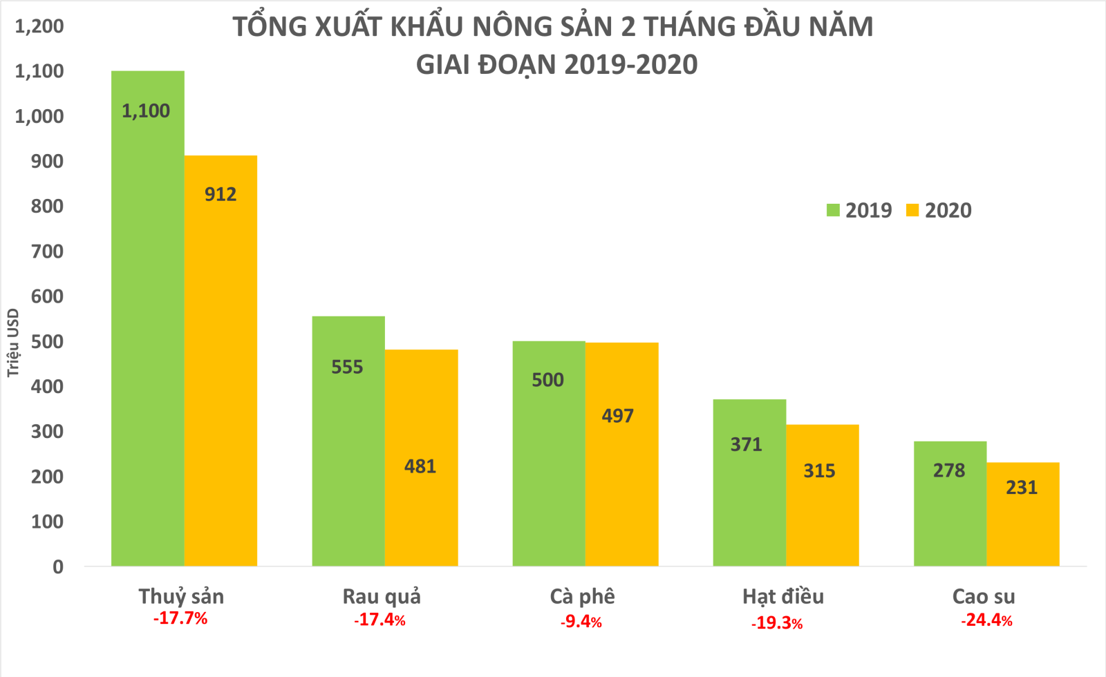 Báo cáo chỉ ra, 4 mặt hàng nông sản xuất khẩu chủ lực đều sụt giảm cả về sản lượng lẫn giá trị trong hai tháng đầu năm. Cụ thể, xuất khẩu rau quả giảm 17,4%, hạt điều giảm 6% về số lượng nhưng giảm tới gần 20% tổng giá trị. Những mặt hàng như cà phê, cao su, sắn hay tiêu cũng đều giảm từ 10-20%.