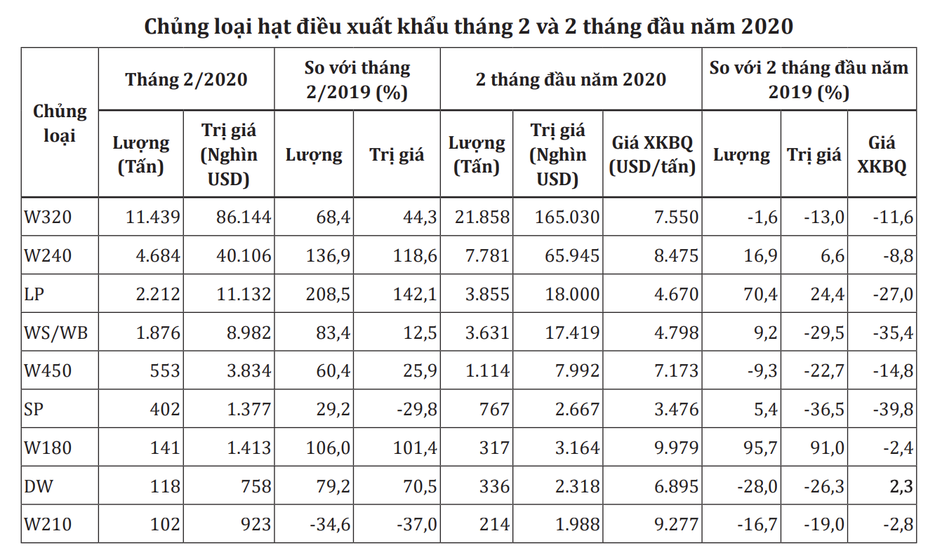 Theo số liệu của Tổng Cục Hải quan, tính chung 2 tháng đầu năm 2020, xuất khẩu hạt điều loại W320 đạt 21,8 nghìn tấn, trị giá 165 triệu USD, giảm 1,6% về lượng và giảm 13% về trị giá so với cùng kỳ năm 2019.