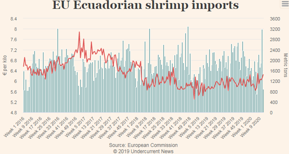 Vào cuối năm 2019 và trong hai tháng đầu năm 2020, các nhà xuất khẩu tôm của Ecuador đã cố gắng đa dạng hóa thị trường xuất khẩu nhằm giảm sự phụ thuộc quá nhiều vào thị trường Trung Quốc - nơi chiếm 60% kim ngạch xuất khẩu của họ.