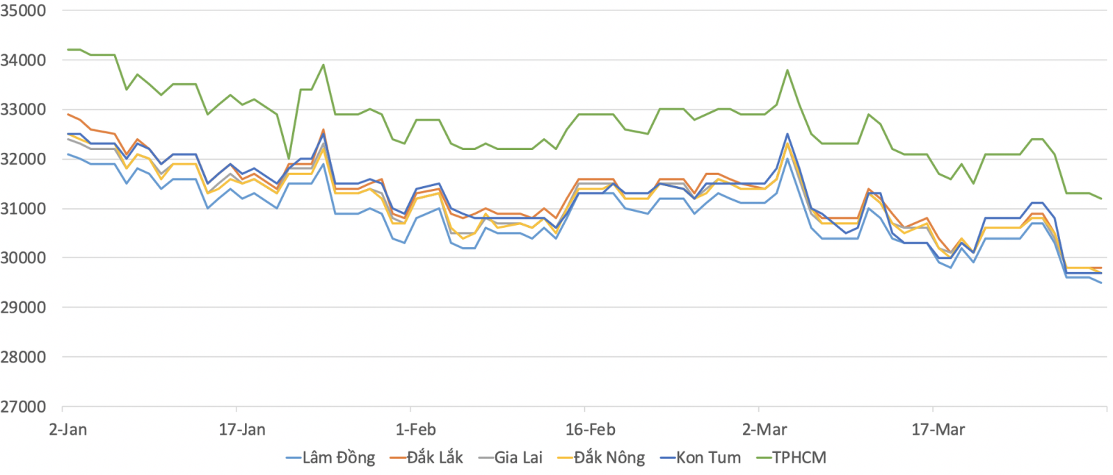 Cụ thể, ngày 30/3, giá cà phê giảm từ 4,8 - 5,7% so với ngày 29/2, xuống còn 29.500 đồng/kg tại huyện Di Linh, tỉnh Lâm Đồng và 30.000 đồng/kg tại huyện Cư M'gar, tỉnh Đắk Lắk.