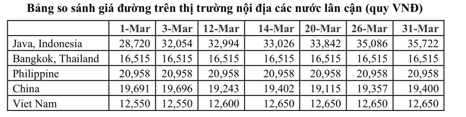 Theo Hiệp hội Mía đường Việt Nam, so với giá đường trong khu vực bao gồm các nước ASEAN và Trung Quốc, giá đường của Việt Nam vẫn nằm ở mức thấp nhất.