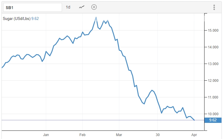 Giá đường trong tháng 4 giảm mạnh so với hồi đầu năm do chịu tác động của giá dầu thô giảm. Theo số liệu của Trading Economics, tính đến ngày 27/4, giá đường lao dốc tới 31,3% so với hồi đầu năm xuống chỉ dưới 10 UScent/pound.