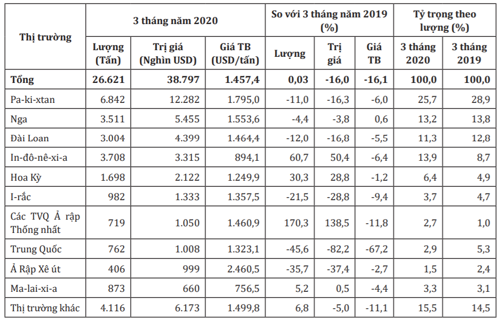 Trong 3 tháng đầu năm 2020, xuất khẩu chè sang ba thị trường chính là Pakistan, Nga và Đài Loan đều giảm.