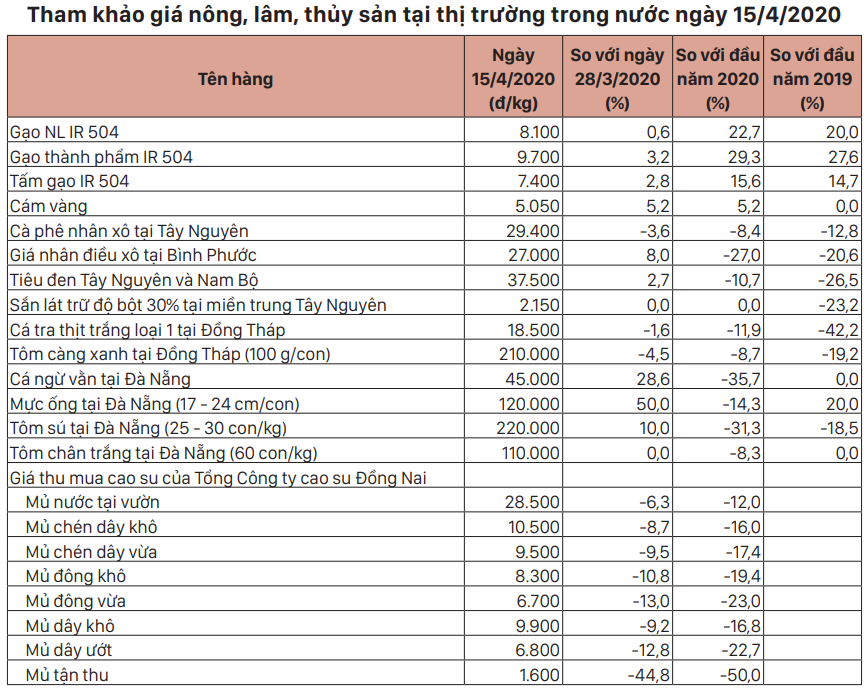 Nửa đầu tháng 4/2020, giá cà phê nhân xô tại các tỉnh Tây Nguyên giảm 3,6% (giảm 1.100 đồng/kg) so với nửa cuối tháng 3/2020. Thị trường khá ảm đạm do hoạt động giao dịch cà phê tại Việt Nam trong kỳ bị gián đoạn, nguyên nhân do thực hiện giãn cách xã hội trong 15 ngày để ngăn chặn sự lây lan của dịch Covid-19. Trong khi đó, nhu cầu cà phê thế giới cũng giảm do tác động của dịch Covid-19.