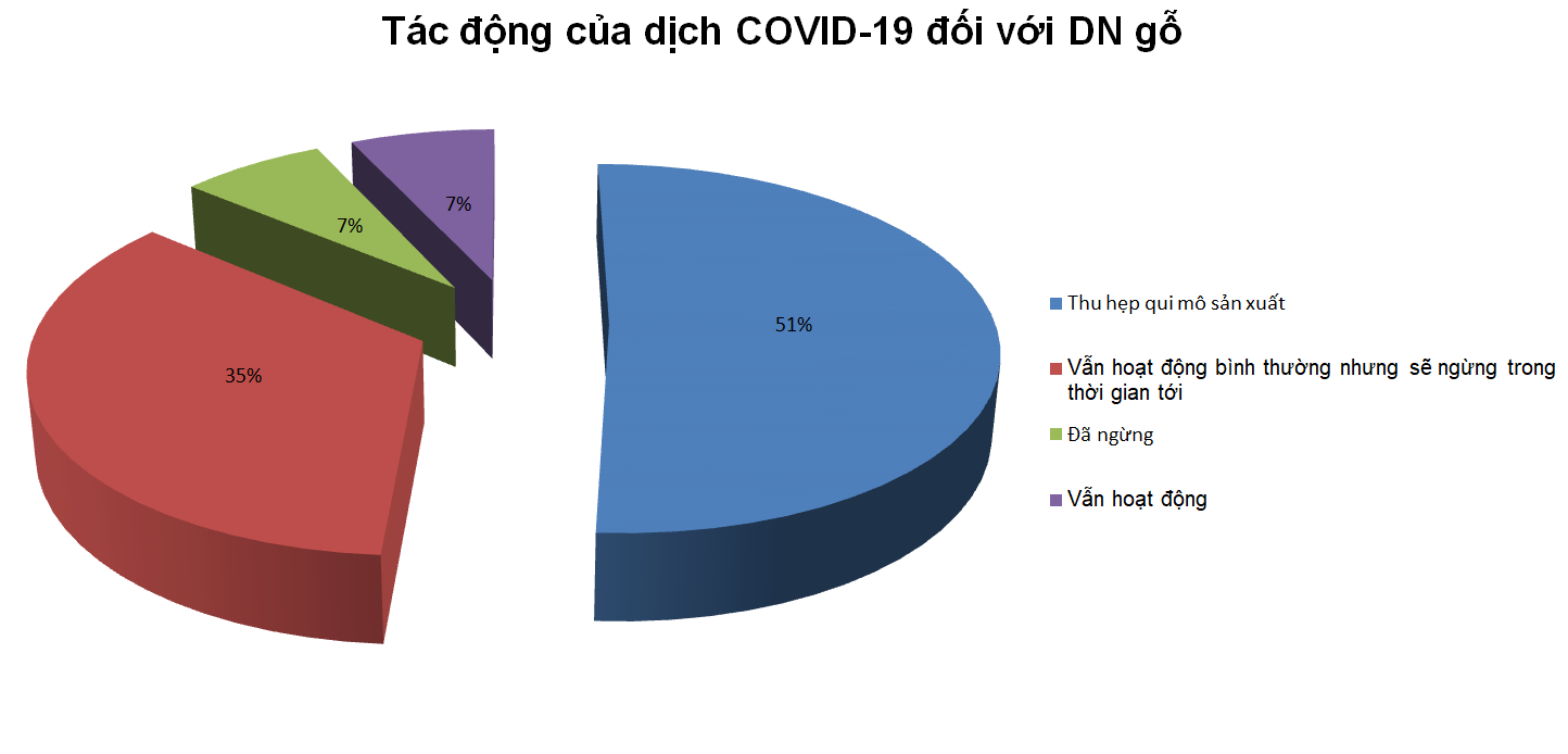 Theo khảo sát của VIFOREST đối với 124 doanh nghiệp gỗ trên cả nước, hơn một nửa số doanh nghiệp (khoảng 51%) đã phải thu hẹp qui mô sản xuất do dịch; 35% đang hoạt động bình thường, nhưng sẽ tạm ngừng sản xuất trong thời gian tới; 7% đã ngừng hoạt động và chỉ có 7% vẫn hoạt động bình thường.