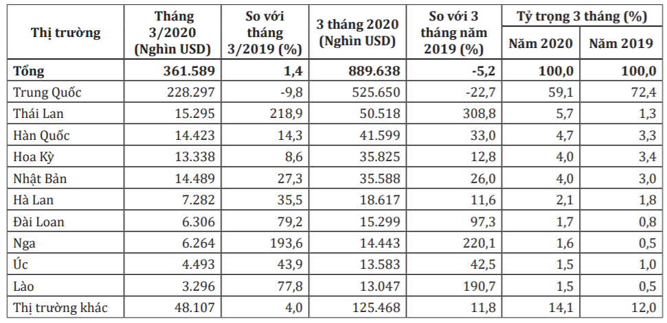 Ngoại trừ xuất khẩu giảm mạnh sang Trung Quốc trong 3 tháng đầu năm 2020, xuất khẩu hàng rau quả của Việt Nam sang các thị trường khác đều đạt tốc độ tăng trưởng cao như: Thái Lan, Hàn Quốc, Mỹ, Nhật Bản...