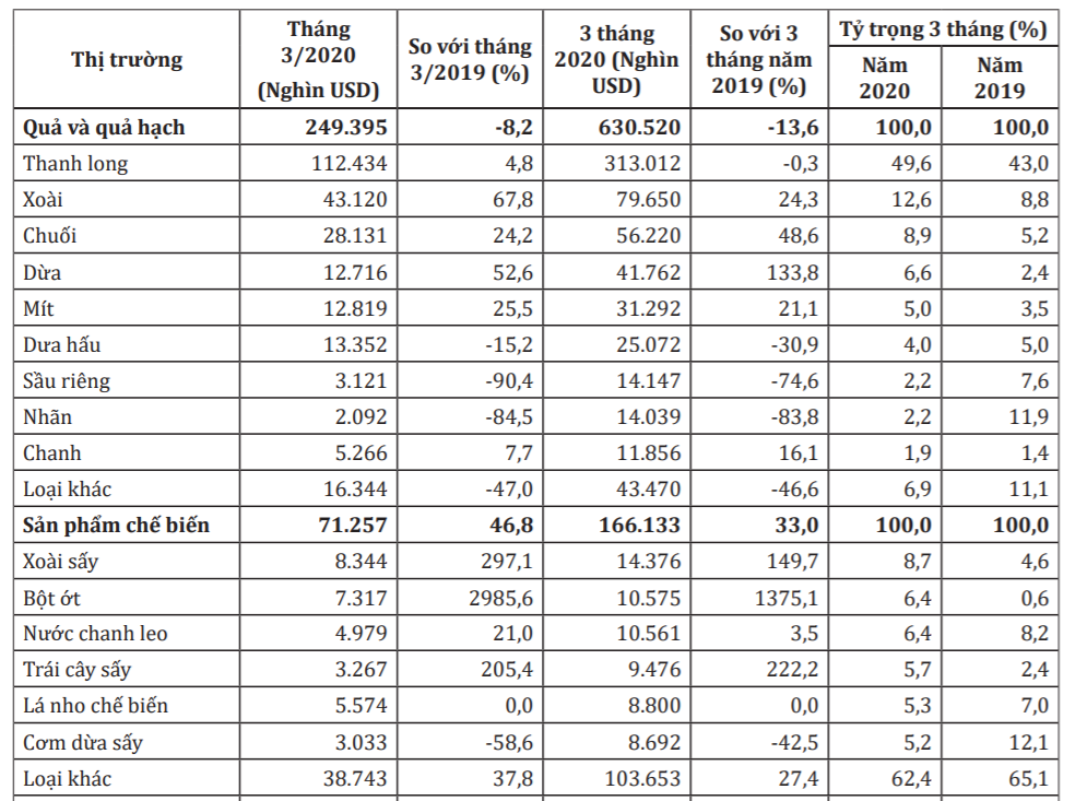 Ngoài ra theo số liệu của Bộ Công Thương trong 3 tháng đầu năm 2020, chủng loại quả và quả hạch vẫn là mặt hàng xuất khẩu rau quả chiếm tỉ trọng cao nhất, trị giá xuất khẩu mặt hàng này đạt 630,5 triệu USD, giảm 13,6% so với cùng kì năm 2019.