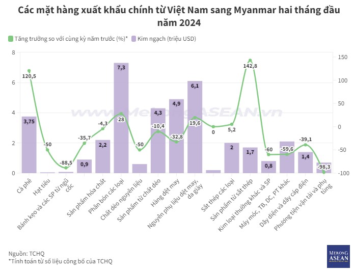 Theo số liệu của Tổng cục Hải quan, 2 tháng đầu năm 2024, Việt Nam xuất khẩu hàng hóa sang Myanmar đạt 52,3 triệu USD, giảm 49% so với mức 103 triệu USD ghi nhận cùng kỳ năm 2023. Việt Nam xuất khẩu 17 mặt hàng chính sang Myanmar, trong đó phân bón là mặt hàng có kim ngạch xuất khẩu lớn nhất với 7,3 triệu USD, tương ứng tăng 28%. Lượng xuất khẩu phân bón sang thị trường này đạt 14.220 tấn, tăng 99% so với mức 7.115 tấn tại cùng kỳ năm trước.