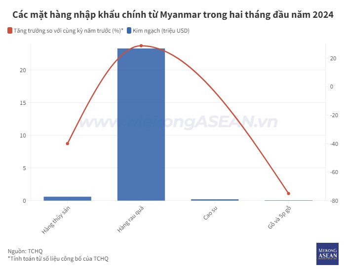 Về nhập khẩu, Việt Nam nhập khẩu hàng hóa từ Myanmar với kim ngạch 49,5 triệu USD, tăng 15% so với mức 42,8 triệu USD ghi nhận cùng kỳ năm trước. Việt Nam nhập khẩu 4 mặt hàng chính bao gồm hàng rau quả đạt 23,3 triệu USD, hàng thủy sản đạt 0,6 triệu USD, cao su đạt 0,2 triệu USD, gỗ và sản phẩm gỗ đạt 59.267 USD.