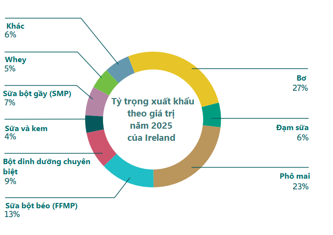 Trong năm 2025, Ireland xuất khẩu hơn 1,6 triệu tấn sản phẩm sữa tới khoảng 142 thị trường trên toàn cầu. Châu Âu, Vương quốc Anh và Bắc Mỹ tiếp tục là ba thị trường chủ lực, chiếm 72% tổng kim ngạch xuất khẩu sữa, đạt 5,4 tỷ euro (khoảng 5,9 tỷ USD), tăng nhẹ so với mức 71% của năm 2024.