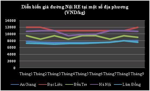 Tại các địa phương trong cả nước, giá đường nhìn chung ít biến động trong 9 tháng qua, do sản xuất và tiêu thụ đường năm nay tương đối ổn định, các nhà máy đường đã có sự chuẩn bị tốt trước khi vào vụ, chủ động được nguồn nguyên liệu để phát huy công suất ở mức cao. Các nhà máy đường, đặc biệt là ở Đồng bằng Sông Cửu Long đã phối hợp với nhau tốt trong tiêu thụ, không để đường lậu tràn vào, tạo sự ổn định cho thị trường trong nước. Trong tháng 6 và tháng 7, giá đường tăng nhẹ khoảng 300 đồng/kg, đạt 11000 đồng/kg tại Bạc Liêu do đây là thời kỳ nắng nóng của mùa hè và chuẩn bị cho tết Trung Thu nên nhu cầu tiêu thụ đường tăng.